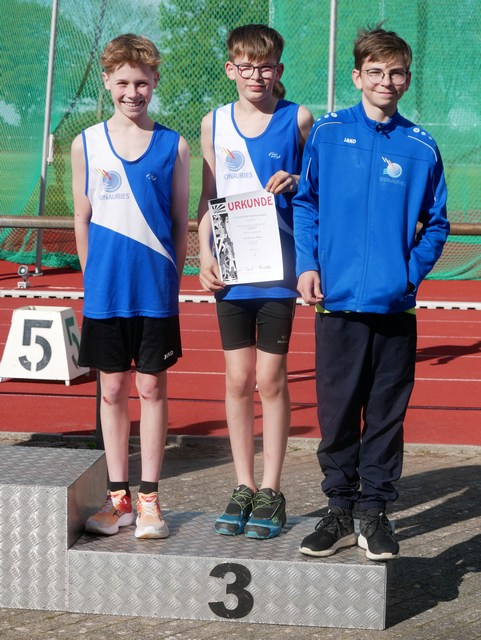 Dort traten bei den mU16 die Rainer Jakob Schuster und Max Reschauer zusammen mit dem Harburger Triathleten Joel Westphal über 3x1000m gegen eine starke Konkurrenz an. Währen Jakob als Startläufer aufgrund des Ausfalles der Zeitmessanlage gleich zweimal starten durfte und dadurch etliche Körner lies, zeigte Joel einen beindruckenden Lauf und brachte die Staffel wieder in eine vordere Position. Max Reschauer hielt bis kurz vor dem Ziel den 2. Platz und wurde in einem spannenden Finish auf dem letzten Meter überholt, so dass die Staffel am Ende auf dem Bronze-Rang landete. Bei den gleichaltrigen Mädchen vertraten Viktoria Zajitschek, Antonia Böhm und Marie Weinberger die LG Donau-Ries über 3x800 Meter. Viktoria als Startläuferin und Antonia übergaben als Zweitplatzierte auf die Schlussläuferin Marie. Diese schloss in einem beeindruckenden Lauf in der ersten Runde auf die führende Läuferin des … auf und setzte sich dann die letzten 200 Meter vom Ziel deutlich ab, so dass sich die Mädchen in einer Zeit von 8:21,45 Minuten über denersten Schwäbischen Titel in der Saison freuen konnte. In der Altersklasse mU12 erreichten Timon Geib, Andreas Buchner und Leander Leland vom VSC Donauwörth über 3x800Meter in 9:41,97 Minuten einen dritten Platz.