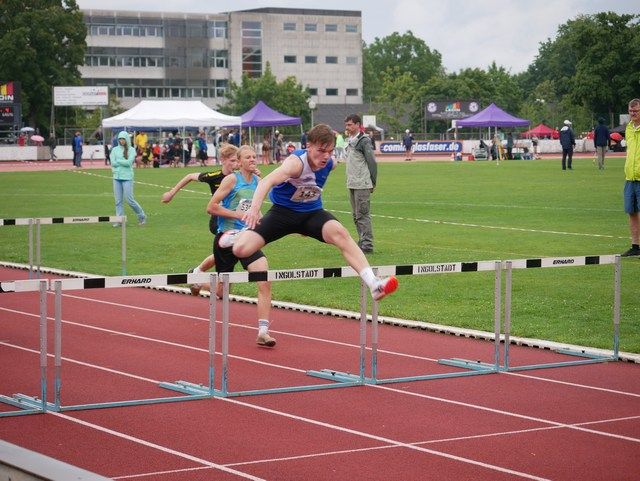 Den Abschluss der Bayerischen Titelkämpfe bildete am letzten Juli Wochenende die Altersklasse U16 in Ingolstadt. Jonathan Federle vom TSV Rain setzte dabei an beiden Tagen das gesamte Trainerteam ins Staunen. So steigerte er sich bei den M15 im Weitsprung um 45 Zentimeter und erreichte somit am ersten Tag der Meisterschaft mit 6,15 Meter den gleich den ersten Titel. Am Folgetag startete er in der Favoritenrolle über die 300Meter Hürden und bewies Nervenstärke. So pulverisierte er regelrecht den bestehenden LG Rekord und verbesserte auf der anstrengenden Strecke seine Zeit um 2 Sekunden. Mit 41,60 sec konnte er den nächsten Titelgewinn feiern. Der Abschluss bildete dann für ihn der Vor- und Endlauf über die 80mHürden. Trotz der Vorbelastung hatte er noch genügend Energie und lief in beiden Läufen mit 11,09sec erneut Bestleitung. Danach konnte er die Silbermedaille in Empfang nehmen.