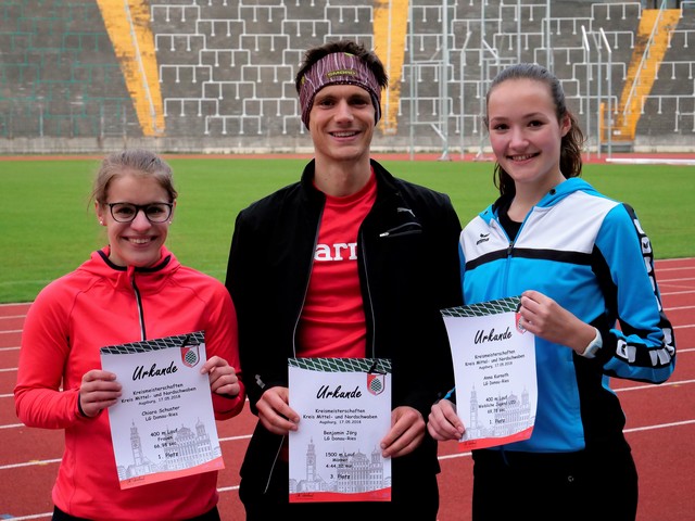 So wagte sich die 18-jährige Anna Kurnoth (VSC Donauwörth) an dem Abend zum zweiten Mal auf die 400 Meter-Strecke. Sie ging ihr Rennen sehr couragiert und etwas zu schnell an, erreichte mit 69,78 Sekunden eine passable Zeit. Damit sicherte sie sich den Kreismeistertitel in der Altersklasse U20. Auf der gleichen Strecke belohnte sich bei den Frauen ihre Vereinskameradin Chiara Schuster in einer Zeit von 66,98 Sekunden für ihre Trainingsarbeit neben der Ausbildung ebenfalls mit dem Titel. Einigster Starter der LG über 1500 Meter war Benjamin Jörg. In der Männerklasse wurde er mit nur 10 Hundertstel Sekunden Rückstand 3 und konnte sich über den Bodestplatz freuen.
