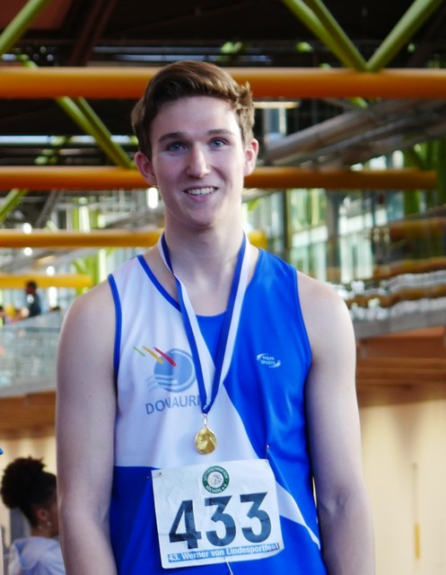 Am Tag 2 kamen dann die „Großen“ zum Zug. Hier testeten vom TSV Rain Jana van Noord (60m) und Mia Bergmiller (60m Hürden) ihre Sprintqualitäten. Genauso wie bei Pia Häselhoff (VSC Donauwörth) im Weitsprung, zeigte sich aber sichtbar ein Trainingsrückstand, da bei den Mädchen in der Altersklasse U18 die Schulabschlüsse anstehen. Erfreulich war dagegen die Entwicklung im 4x200m-Staffellauf den die Drei zusammen mit Marion Kleinle bestritten. Mit einer Zeit von 1:53,63 Minuten konnten sie wieder an ihre Ergebnisse vom letzten Jahr anknüpfen. Zeitgleich zu den spannenden Staffelläufen lief der Wettbewerb im Kugelstoßen bei den mU18. Hier stellte sich Alexander Bauer nach längerer Wettkampfpause mit der 5 Kilo schweren Kugel der Konkurrenz. Schon beim Einstoßen zeigte sich, dass Alexander nichts verlernt hatte. So gewann er den Wettkampf deutlich mit einer neuen Bestleistung von 12,36 Metern und konnte noch am Kugelstoßring die goldene Medaille mit dem Konterfei des Werner-von-Linde entgegen nehmen.