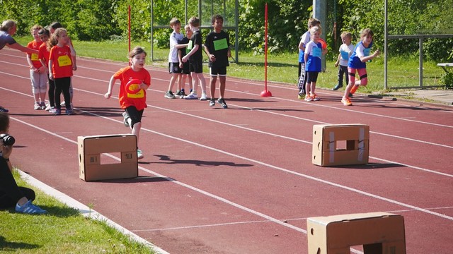 Die Disziplinen, die höhere koordinative Ansprüche an die Kinder stellen, als das klassische weiter/höher/schneller, werden als Mannschaftswettkampf in einer Cup-Wertung ausgetragen. Die Schulsportanlage beim Georg-Weber-Stadion in Rain war am vergangenen Wochenende die 2. Station des Cups. Der Wettkampf begann in der Altersklasse der 8 bis 9-Jährigen mit einer Hürdenpendelstaffel. Dabei werden statt den „furchteinflößenden“ Hürden Bananenkartons als Hindernisse verwendet, um die Kinder an die schwierige Disziplin heranzuführen. Im Anschluss ein Drehwurf mit Wurfringen und der Hoch-Weitsprung in die Sandgrube. Die LG Donau-Ries trat hier sogar mit 2 Mannschaften an und sicherte sich die Plätze im Mittelfeld, da sie sich vor allem im abschließenden Team-Biathlon zu viele Strafrunden einhandelten. Dieser Wettkampf ist immer der spannende Höhepunkt – auch für die zahlreichen Zuschauer, die am Rand mitfieberten. Ähnlich wie bei den Profis müssen Kinder beim Werfen Ziele treffen und bei Fehlwürfen entsprechend Strafrunden laufen. Wobei es aber gilt als 2er Team sich gegenseitig auf der rund 400m langen Laufstrecke zu unterstützen.