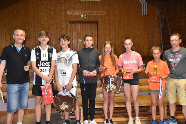 Im Schülerlauf über 2500 Meter schafften es drei Nachwuchssportler unter die Zehn-Minuten-Marke. Marco Rühl (TSV Ebermergen) lag in 9:21 Minuten vorne. Rang zwei sicherte sich der Mündlinger Michael Fritz der für den TSV Ebermergen antrat (9:51), Dritter wurde der drei Jahre jüngere Luis Rühl (TSV Harburg Triakids, 9:53). Schnellstes Mädchen war Chiara Göttler (TSV Harburg, 10:53) vor Stine Schreitmüller (TSV Ebermergen, 10:59) und Julia Weiland (TSV Harburg, 12:38). Insgesamt registrierte der gastgebende TSV Ebermergen im Schülerlauf 45 Teilnehmer. Den Preis für die meisten Starter auf der Kurzstrecke gewannen überlegen die Harburger Triakids mit 33 Läufern. Die Siegerehrung nahmen in der TSV-Turnhalle Volker Wagenknecht und Christian Weiland vor.