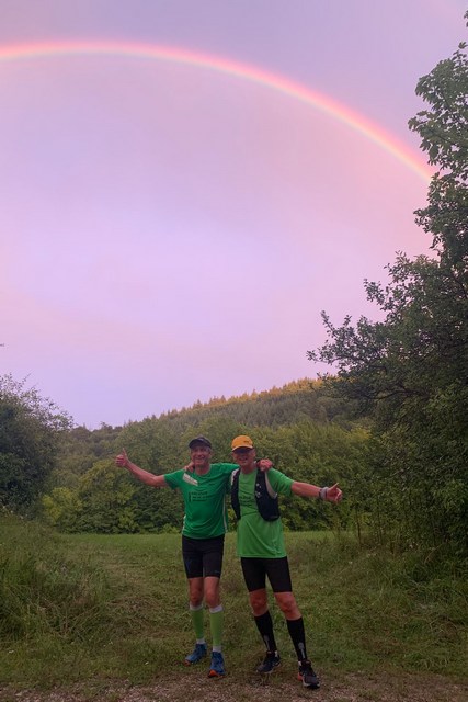 Mit insgesamt 9 Versorgungsstationen und ständig wechselnden, bis zu 10 Begleitläuferinnen und Läufer, sowie bis zu 5 Radbegleitern kam nie Langeweile auf. Bei Eisbrunn schloss sich noch ein Läufer aus Mauren an. Über dem Nördlinger Trinkwasserreservoir überraschte die Gruppe ein wunderschöner Regenbogen noch kurz vor dem Ziel.