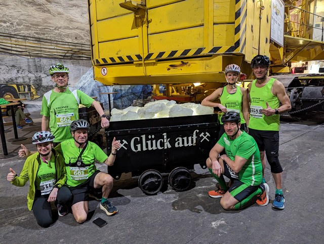 Ab 7:30 Uhr in der Früh konnten die Startunterlagen im Eingangsbereich des Erlebnis Bergwerks abgeholt werden. Anschließend ging es für Sportler und Begleitpersonen 500 Meter unter die Erde. Voraussetzung um überhaupt teilnehmen zu dürfen war das Tragen eines Fahrradhelms und einer Stirn- oder Brustleuchte. Nach dem Ausstieg aus den Aufzügen wurden alle mit Lastwagen rund einen Kilometer, bergauf, bergab in engen Kurven zum ehemaligen Großbunker gebracht, wo sonst immer wieder Konzerte stattfinden, an diesem Tag war hier der Start- und Zielbereich der Wettkämpfe. Hier stand für jeden Teilnehmer ein Stuhl zur Ablage und zum Sitzen bereit. Eine halbe Stunde vor dem ersten Start wurde noch eine tolle Lasershow geboten und das Steigerlied gespielt und gesungen.
