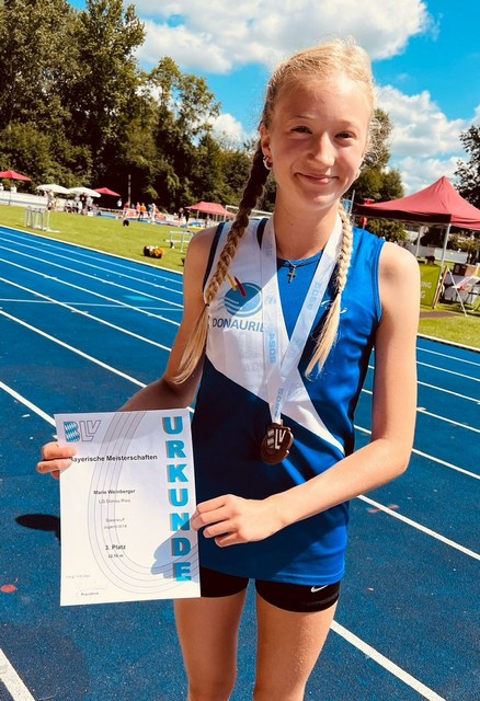 Ein erfolgreiches Debüt bei den Bayerischen Meisterschaften konnte Marie Weinberger auf der blauen Bahn in Erding feiern. Die erst 13-jährige VSClerin erfüllte die Qualifikationsleistungen im Speerwurf und über die 800m für die weibliche Jugend W14 und ging über beide Disziplinen an den Start.